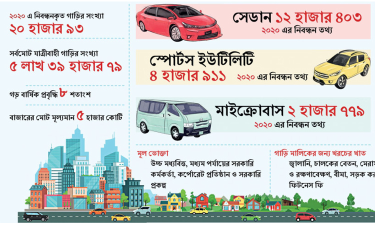 বাংলাদেশ সড়ক পরিবহন কর্তৃপক্ষের (বিআরটিএ) দেওয়া তথ্য অনুযায়ী, ২০২০ সালে মাত্র ২০ হাজার ৯৩টি ব্যক্তিগত গাড়ির নিবন্ধন হয়েছে, যেটি আকারের দিক দিয়ে মোটরযান শিল্পের মাত্র ৫ দশমিক ৩ শতাংশের সমান।